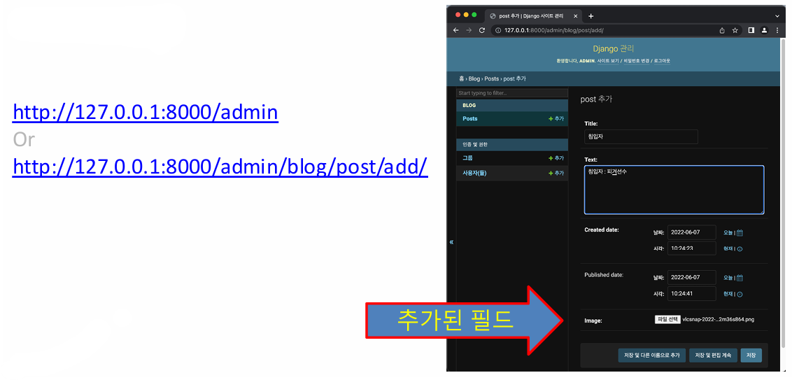 이러한 과정으로 모델에 이미지 필드 추가를 완료하고,