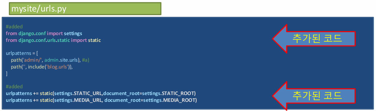 Static 및 Media 파일 접근을 위한 url 패턴을 추가한다.