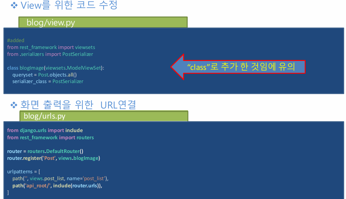 - Serializers: models 객체와 querysets 같은 복잡한 데이터를 JSON, XML과 같은 native 데이터로 바꿔주는 역할