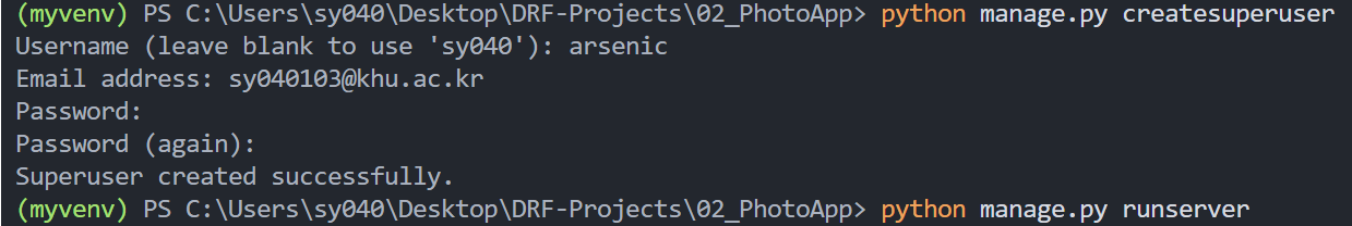 Django에서 기본적으로 제공해 주는 관리자 페이지이다. 계정 등록을 위해서는 콘솔에 다음과 같은 명령어를 입력해야 한다.