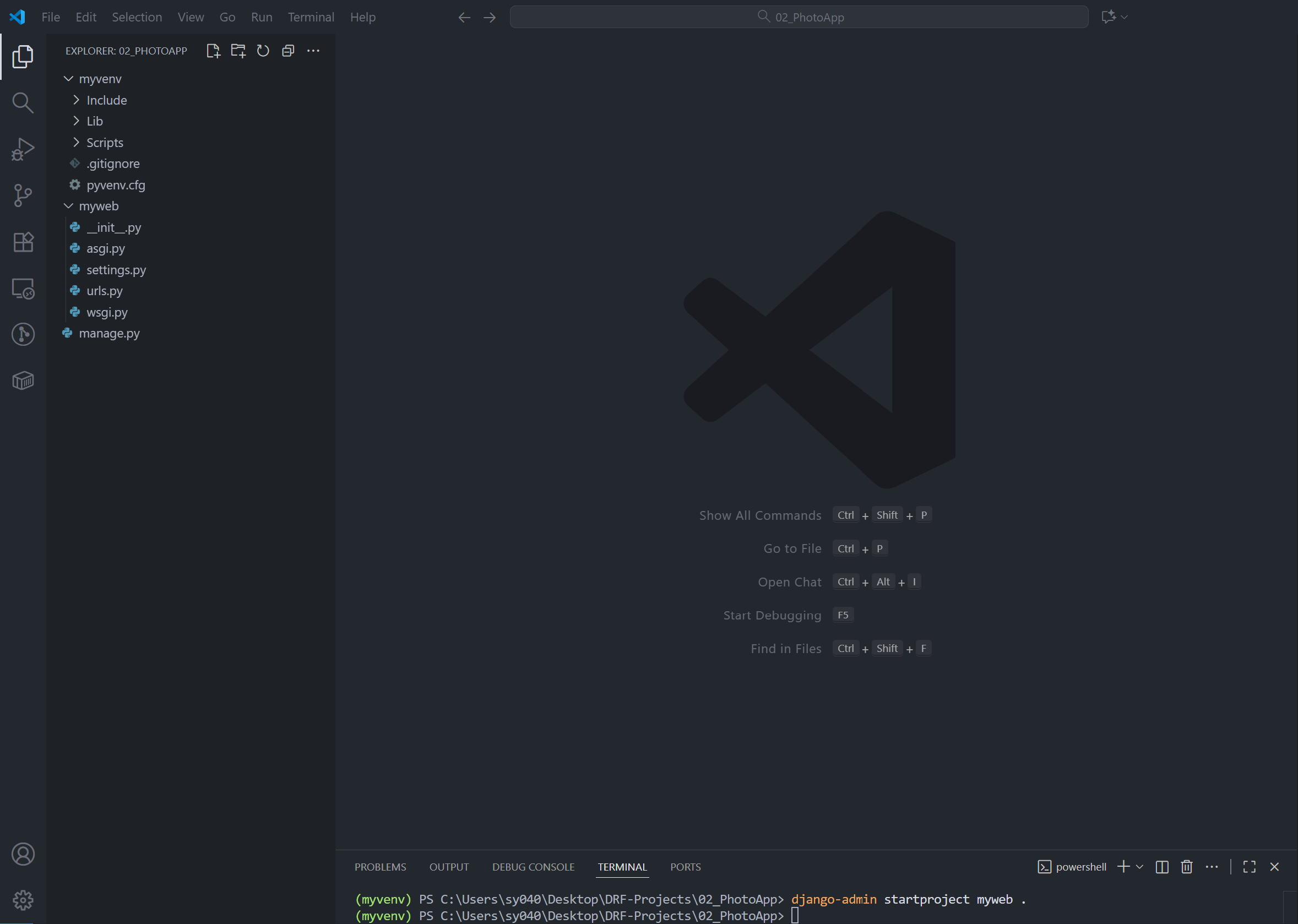 이렇게, 설치를 모두 완료한 후, 아래 명령어를 통해 새로운 Django 프로젝트를 만든다.