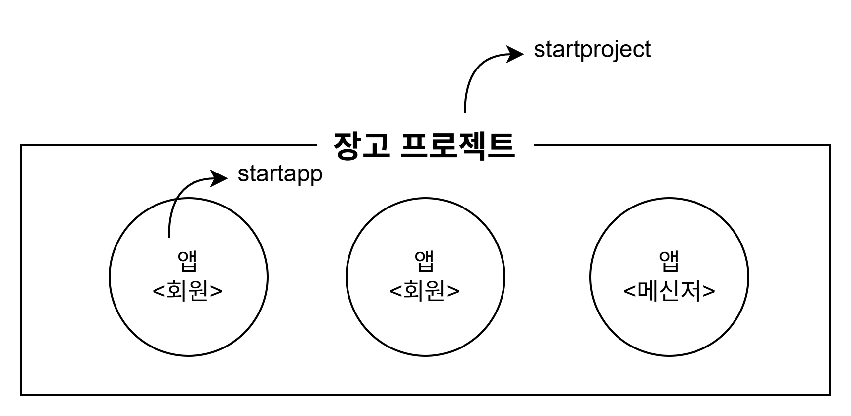 startproject와 startapp 명령어를 통해 각각 프로젝트와 프로젝트 내부에 들어갈 앱을 만들었는데,