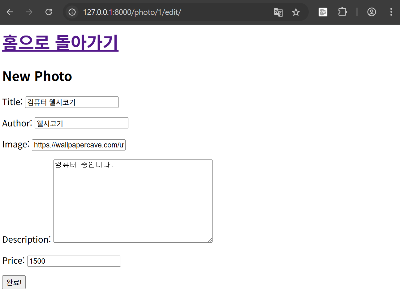 비워져있는 폼에 데이터만 채우면 수정 기능이 되기 때문에 템플릿은 별도로 작성할 필요 없이 작성 기능의 템플릿인 photo_post.html을 동일하게 사용한다.