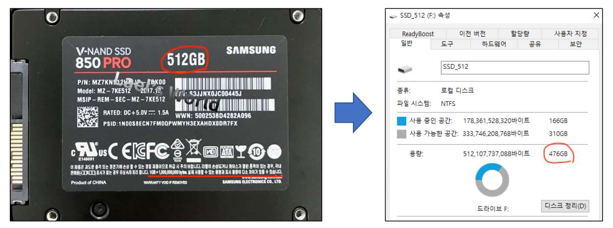 표기 용량과 실제 용량의 차이가 발생하는 이유는,