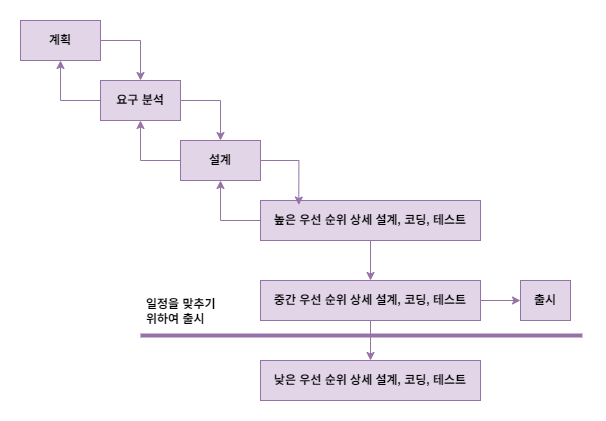 ※ 앞에서 단계적 개발 모델은 우선순위라는 개념이 없지만, 일정 중심 설계 모델은 우선순위라는 개념이 있다.