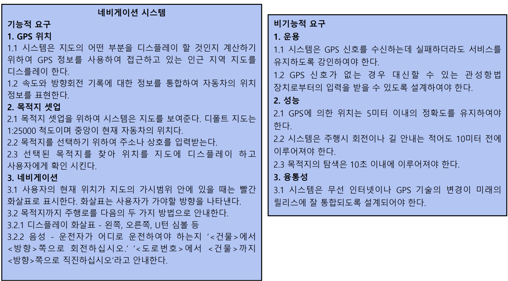 - 비기능 요구사항이 중요한 소프트웨어에는 군사 무기, 의료 장비 (오차에 민감) 등이 있음