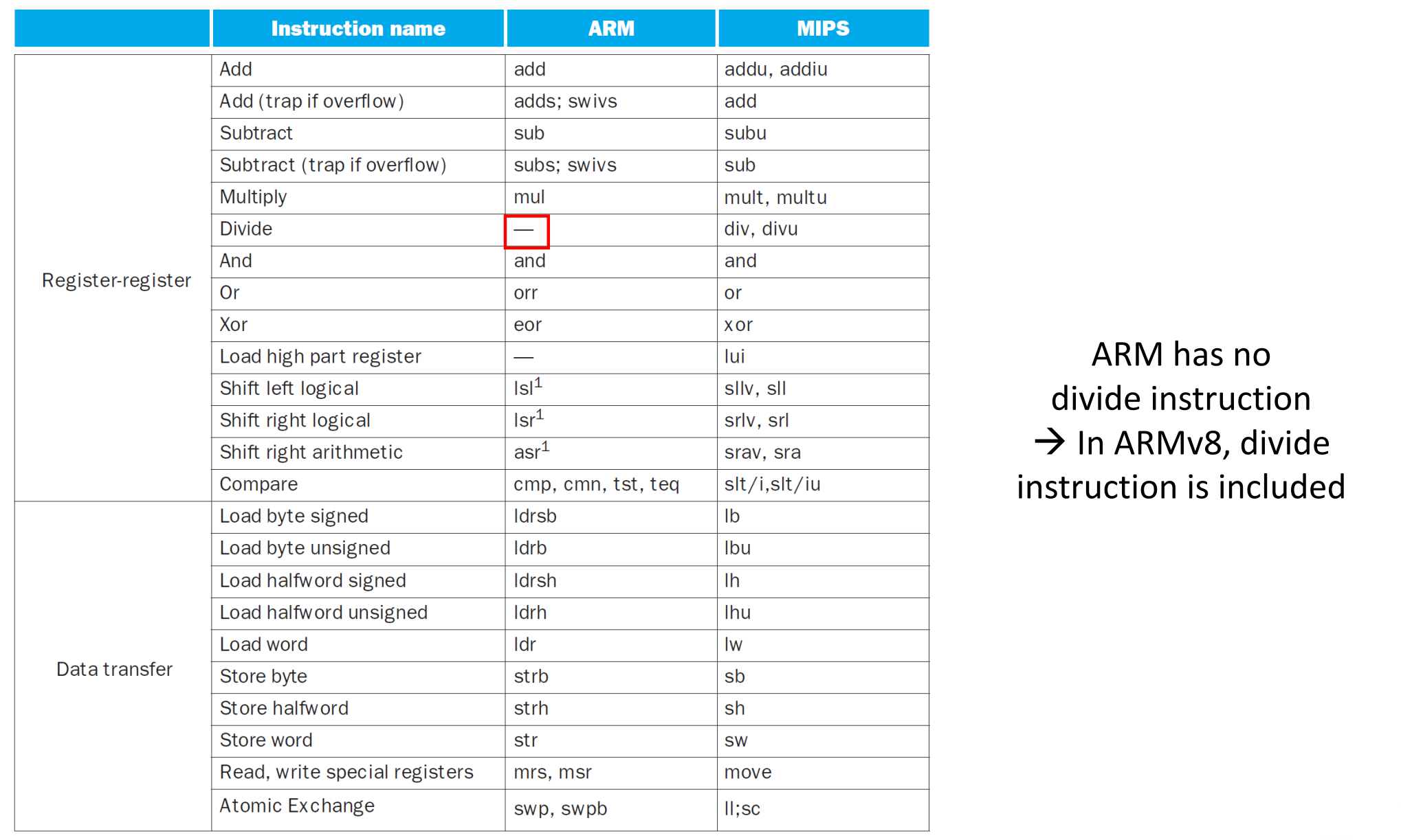 나누기는 다른 연산보다 시간이 오래 걸리기에 ARM은 버리길 선택, 즉 속도에 집중하였다. (경량화)