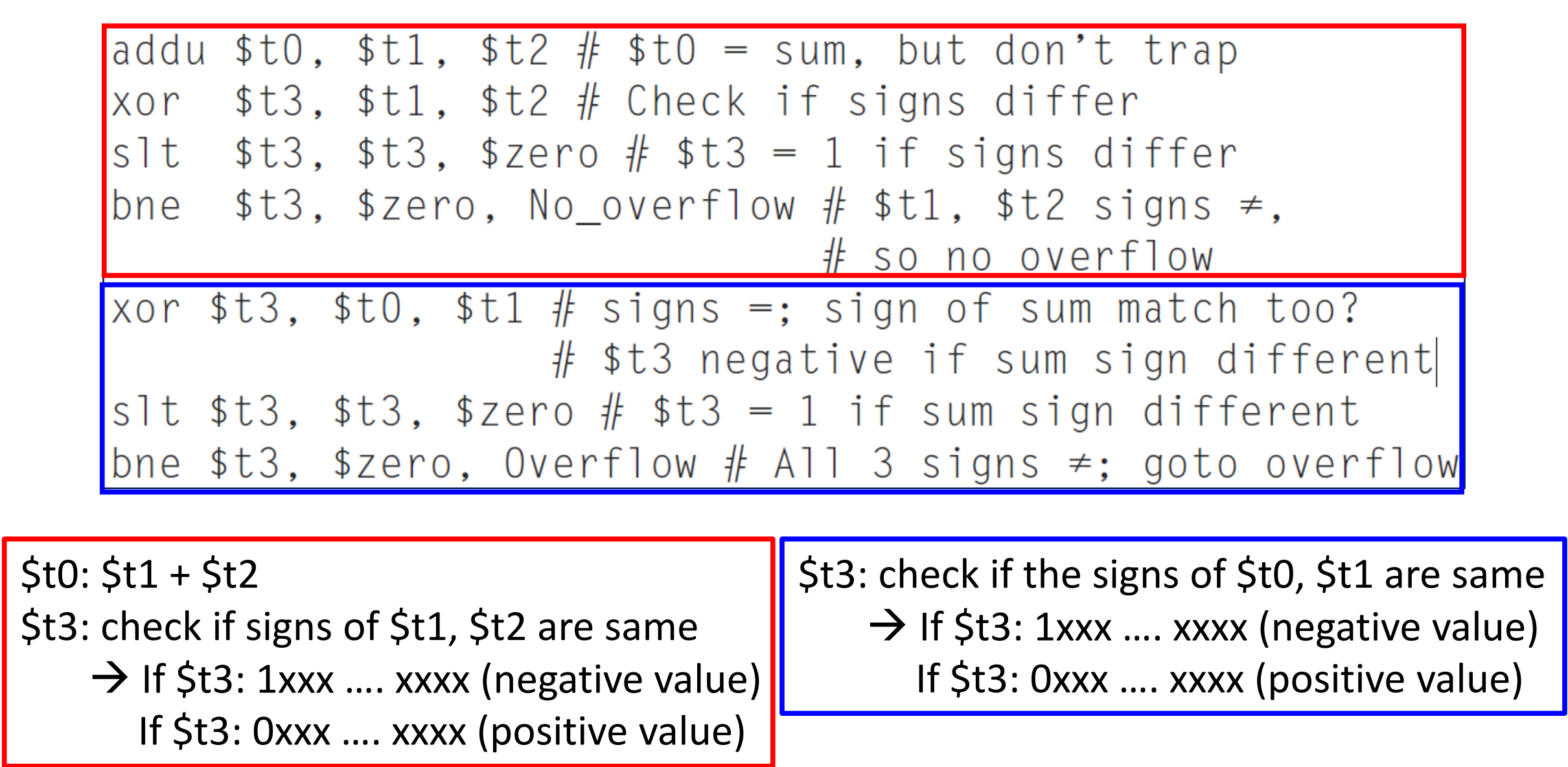 ▶ Overflow가 발생하지 않았으면, 즉 MSB가 바뀌지 않았으면 $t0와 $t1의 MSB 값이 같아 $t3의 MSB 값은 0이 됨 (양수)