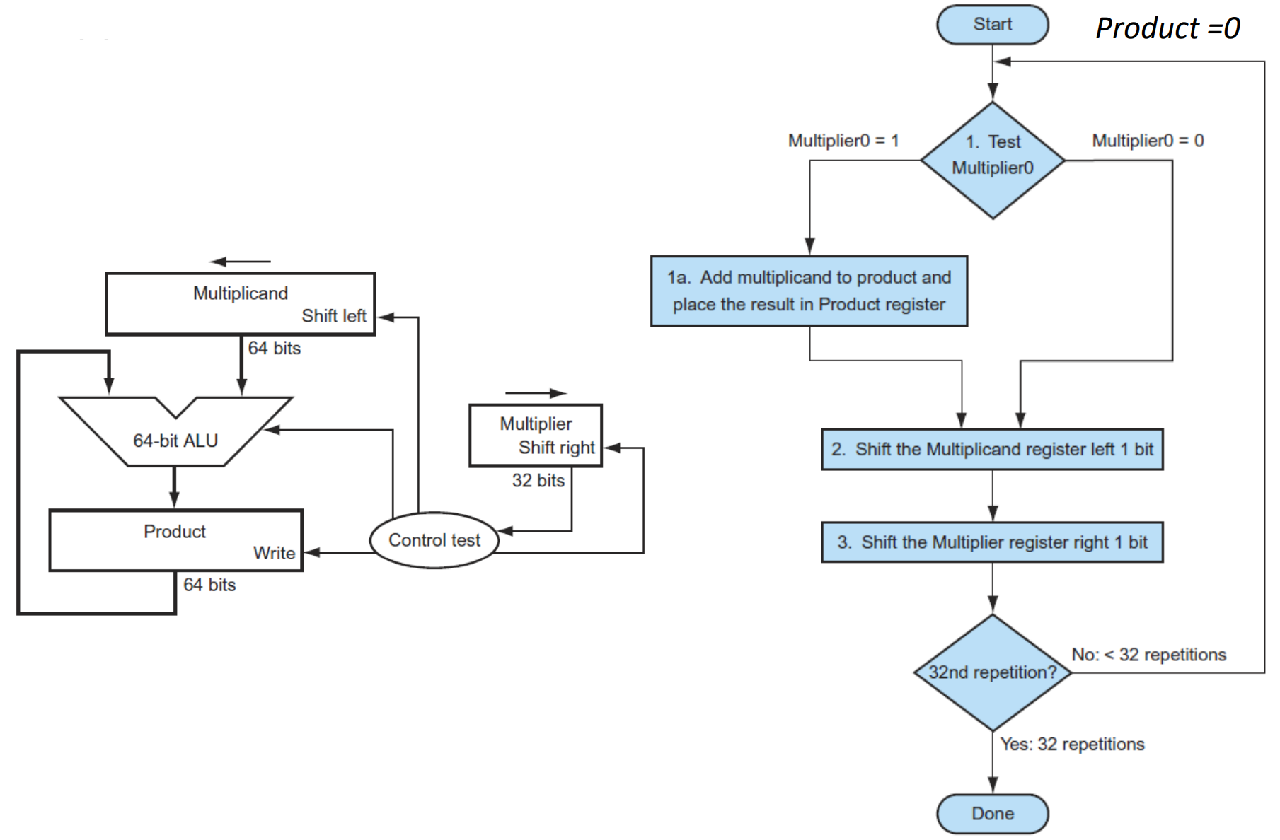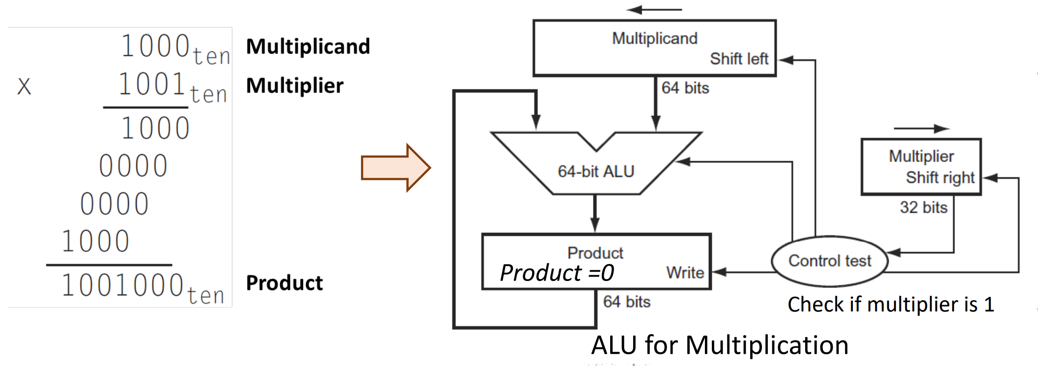 2. Multiplier의 각 비트를 하나씩 확인하며 진행되는데, 먼저 Multiplier의 LSB부터 1인지 확인하는 Control test를 거친다. 이때 1이면 Multiplicand를 복사해 적당한 위치에 값을 넣어 Product에 누적하고, 0이면 그냥 넘어간다. 그리고 다음 비트로 갈 때에는 Multiplicand는 sll을 하여 적당한 위치를 찾고(자릿수), Multiplier은 srl을 하여 다음 비트 확인을 위해 LSB를 버리도록 한다. 즉, 이런 식으로 Product Update를 한다.