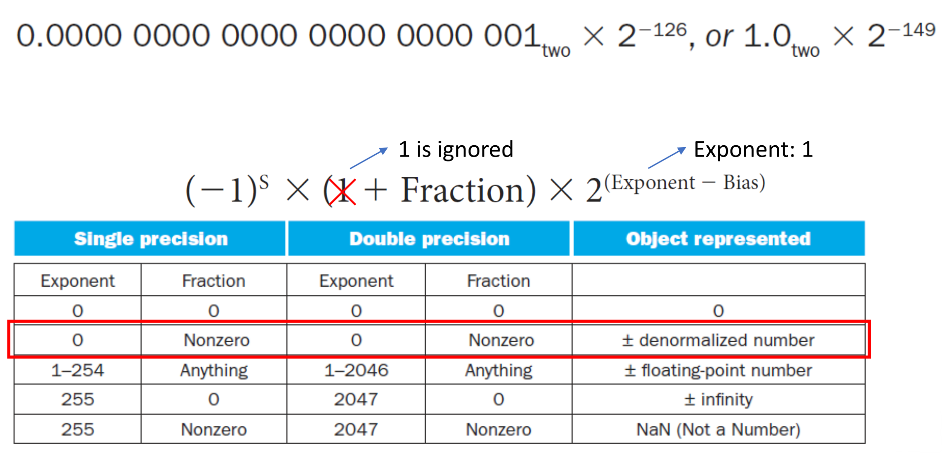 single precison의 경우, 1.0 × 2^-126이 가장 작은 수인데, 이보다 더 작은 수를 표현하고 싶을 때 사용한다.