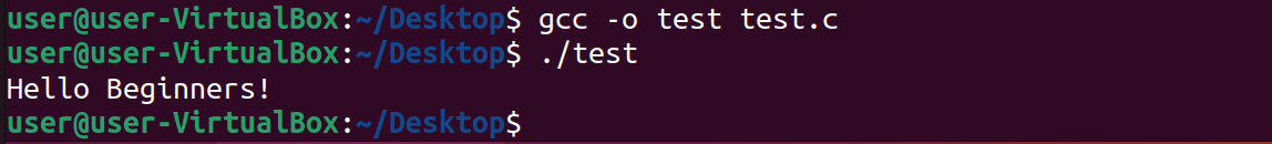 설치가 완료되면 test.c 파일이 있는 디렉토리로 이동하고 컴파일한다. 아래는 test.c 파일을 실행 가능한 test 파일로 컴파일하는 명령어이다. 컴파일 후에 ./test 명령으로 test 파일을 실행하면 "Hello Beginners!"가 출력된다.