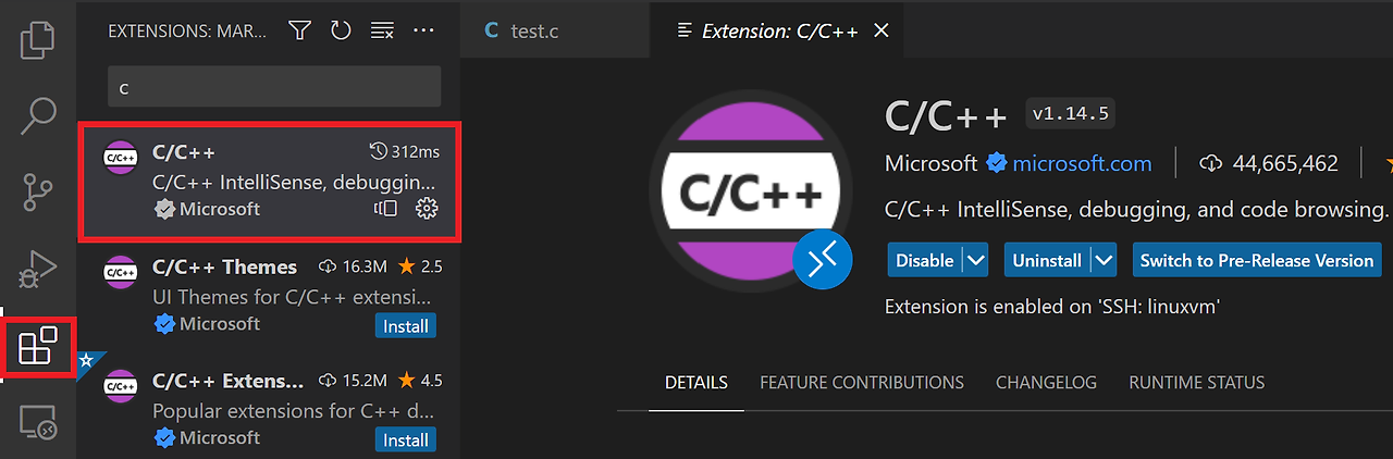 1. VS code를 열고 좌측 탭의 Extensions를 클릭하여 C/C++을 Install 한다.