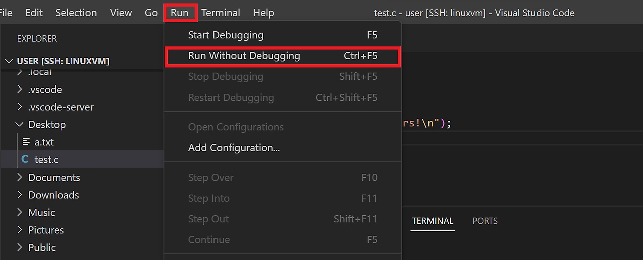 2. 상단 메뉴에서 Run - Run Without Debugging 혹은 단축키 Ctrl + F5로 코드를 실행한다. 그러면 VS code에서 자동으로 소스 코드를 컴파일하고 실행 파일을 생성하여 실행한다.