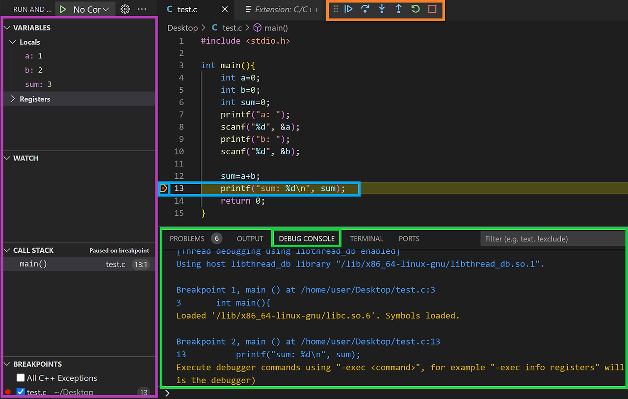디버깅을 시작하면 좌측 Debug View에서 VARIABLES(변수), WATCH(변수 또는 표현식의 결과), CALL STACK(호출한 함수), BREAKPOINTS(사용자가 설정한 중단점 목록) 등의 정보를 확인할 수 있다.