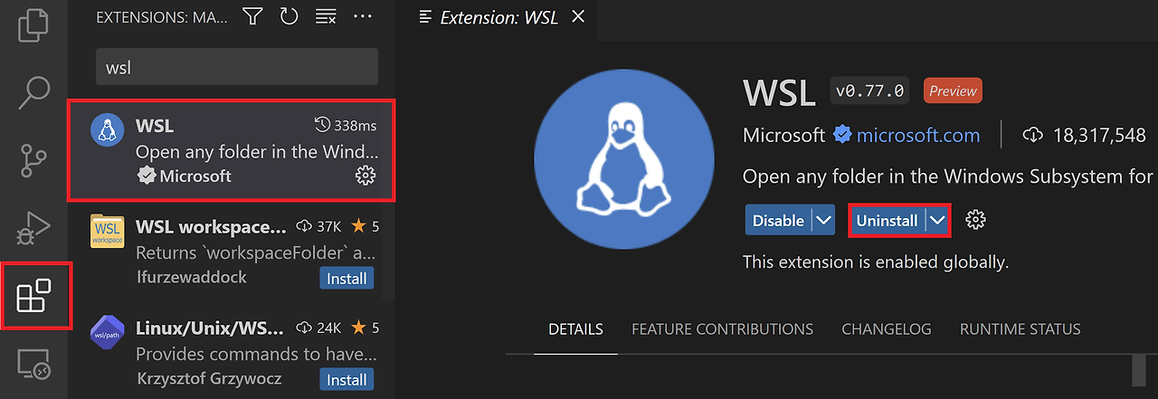 VS Code 좌측 Extensions 탭을 열어 wsl을 검색한다. WSL extension을 클릭하고 Install 버튼을 눌러 설치한다.