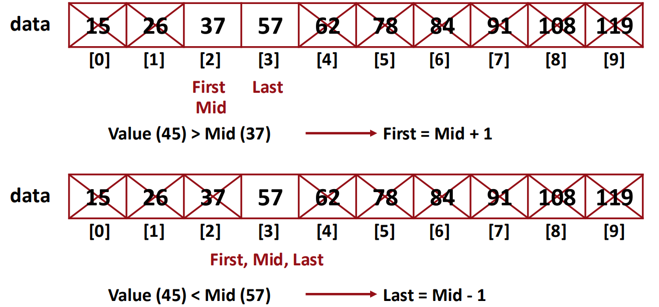 Binary Search는 한 번 비교할 때마다 리스트 길이의 절반씩 버려 탐색 범위를 기하급수적으로 줄인다.