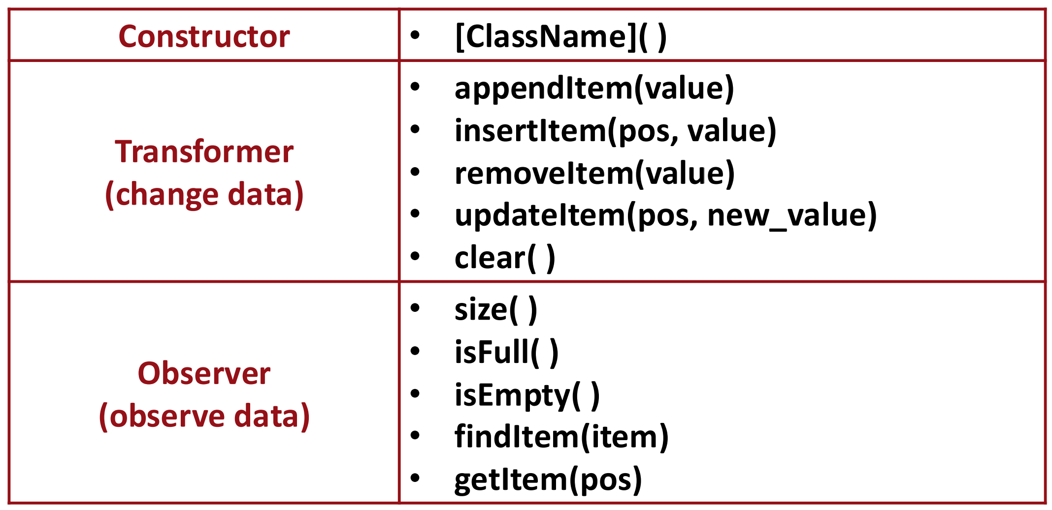 | Transformer (변경 연산) | 객체 내부 데이터 변경 | deposit(), withdraw() // 입금, 출금 -> balance 변경 |