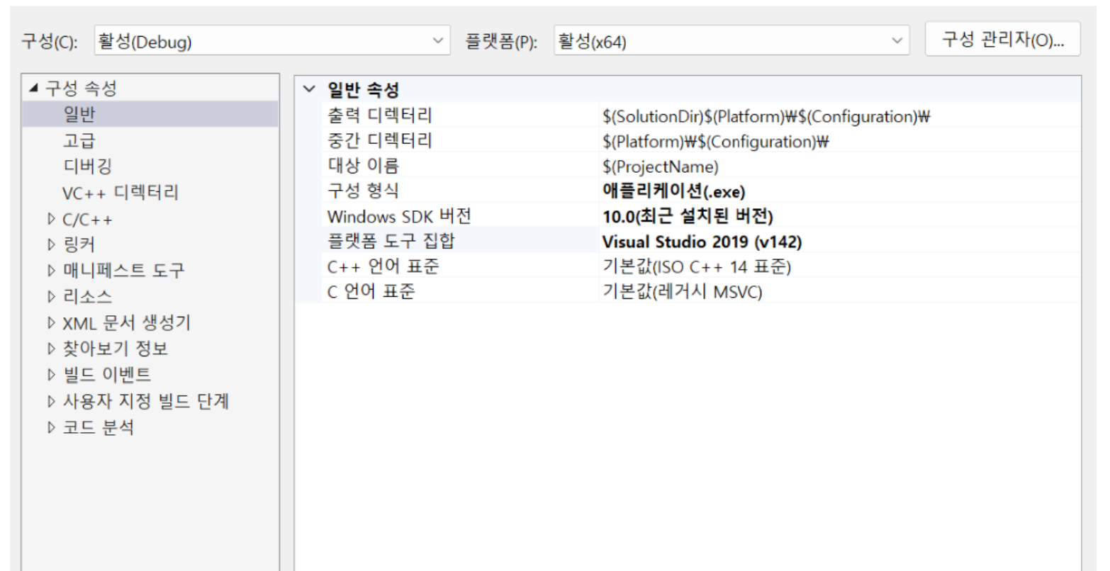 - [일반] - [플랫폼 도구 집합] 에서 자신의 visual studio 버전에 맞게 선택