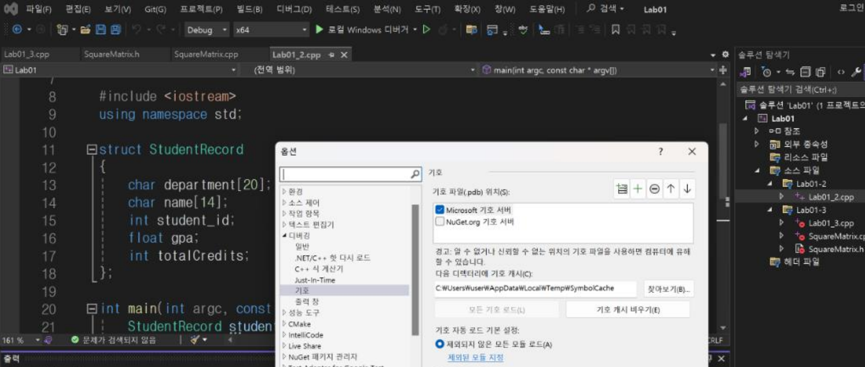 ▶ 디버깅 옵션에서 Microsoft 기호 서버 설정