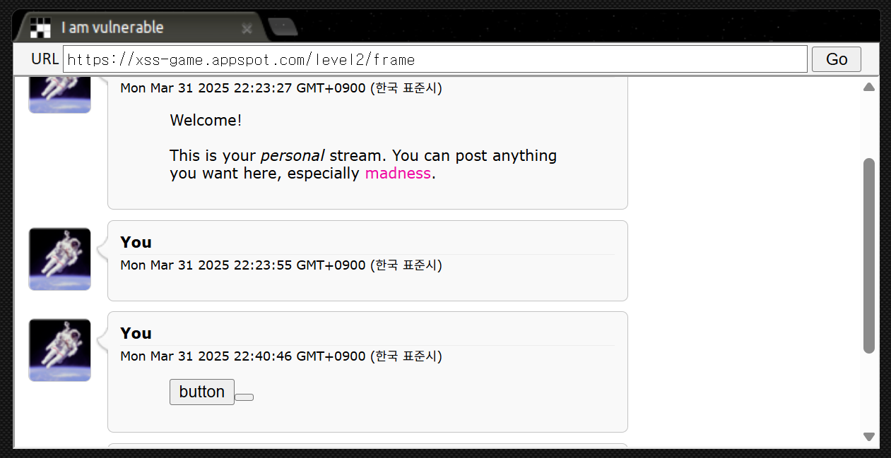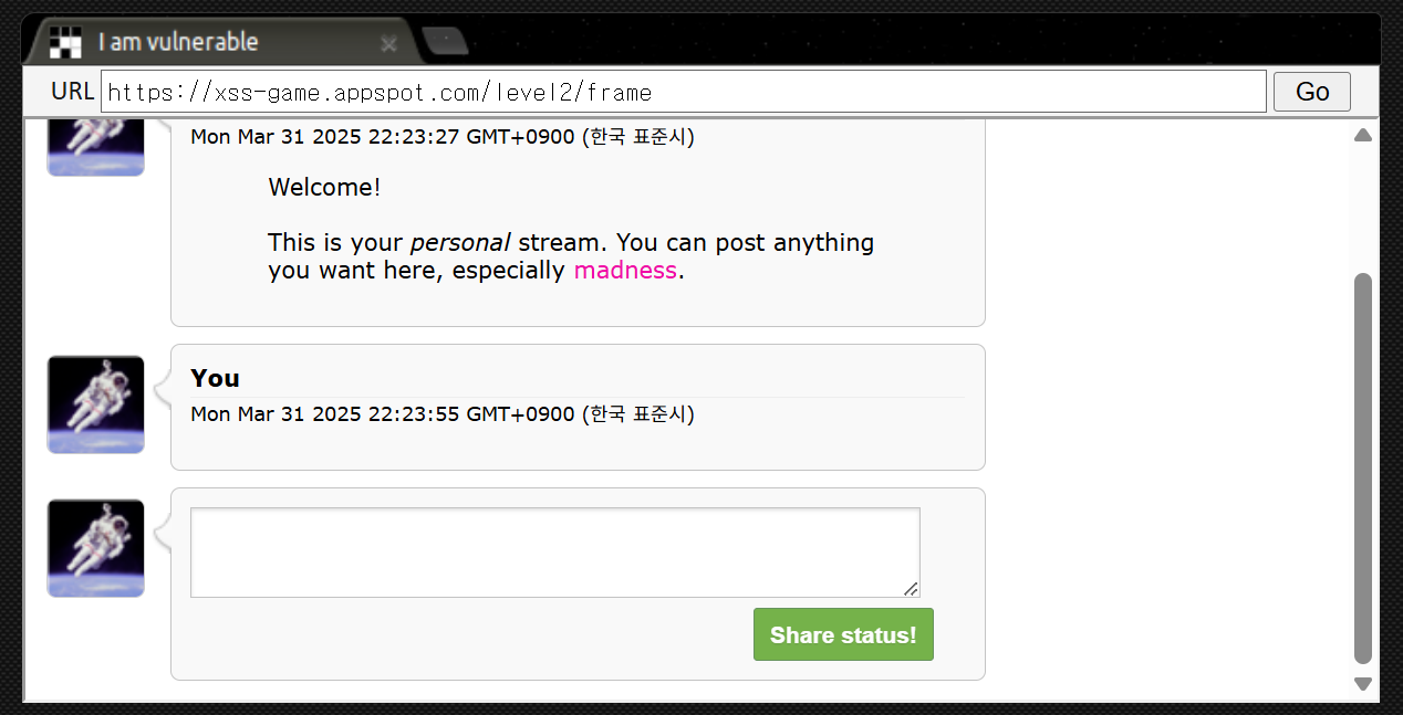 XSS game은 XSS 공격을 통해 다음과 같이 alert()를 띄우는 게임이다.