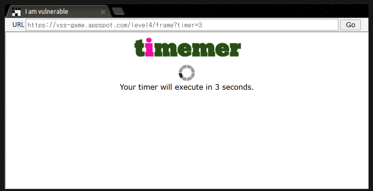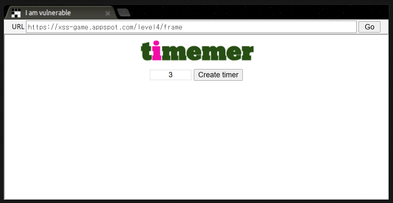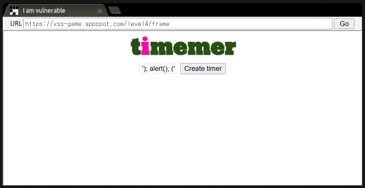 {{ timer }} 부분에 '); 이거로 기존 onload 함수를 닫아버리고 alert(); (' 를 넣어주면, (문법 맞춰 오류 방지)