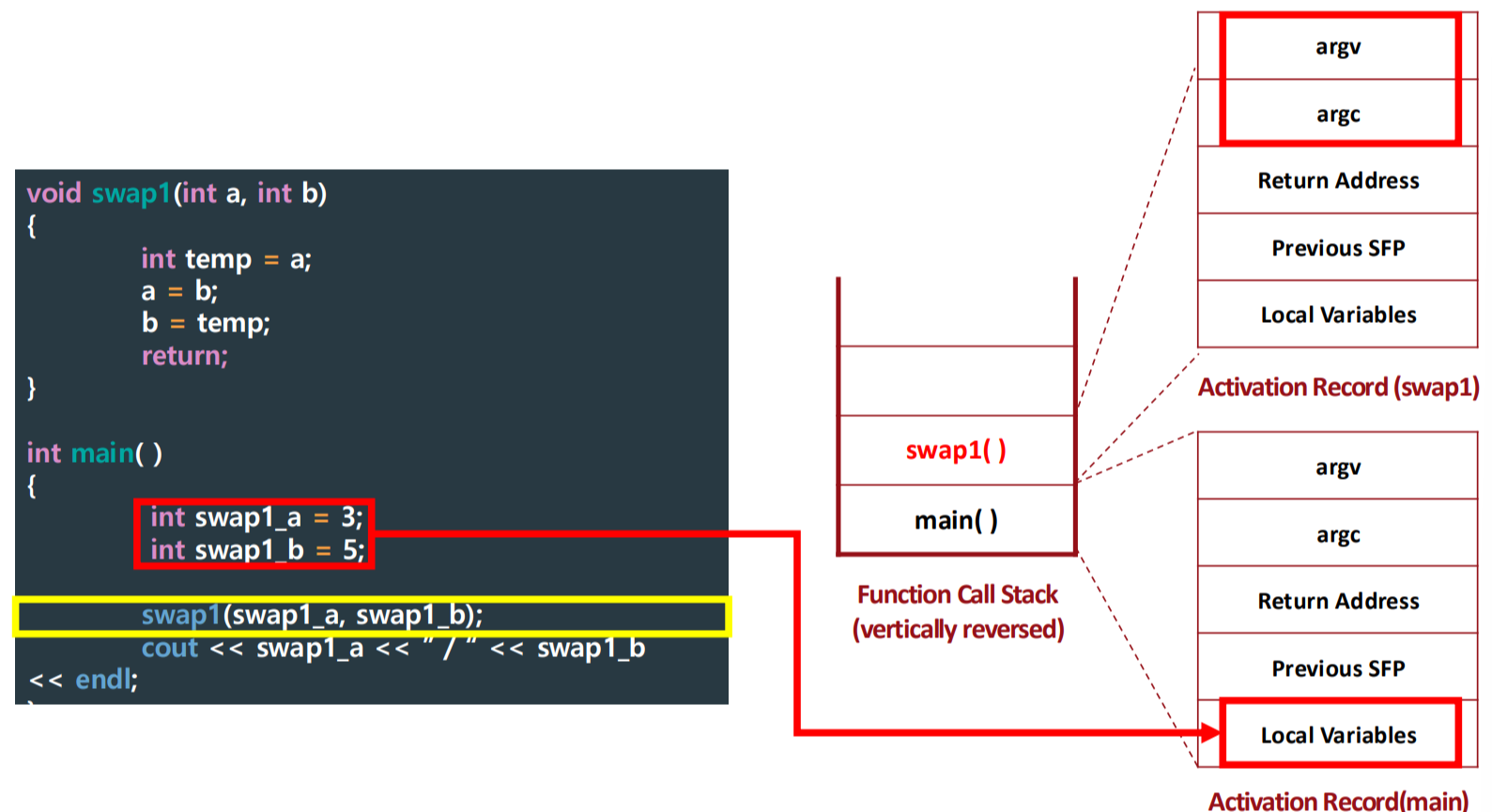 Function call of 'swap1()' generates an activation record.