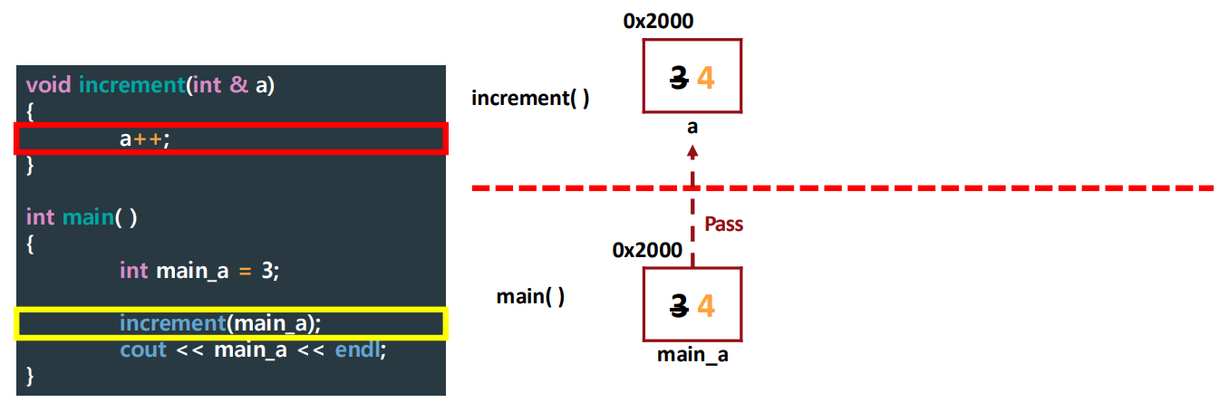 It passes 'main_a' as 'a' (both share the same memory, 0x2000)
