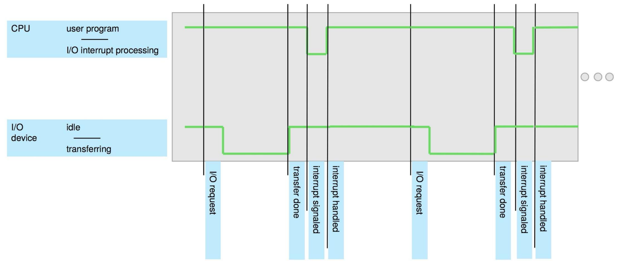 - 0 -> 1 감지되면 CPU는 원래 하던 명령어 멈추고 interrupt handling 모드로 넘어 감