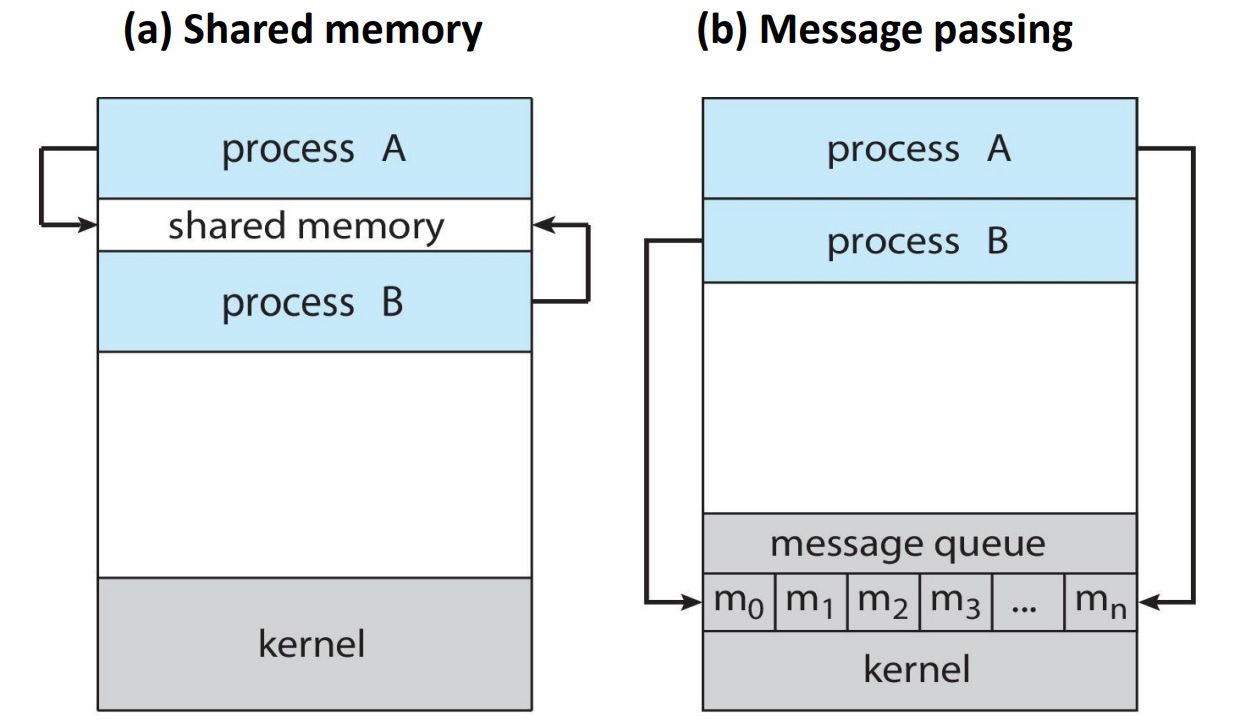 - Message passing: 커널 안의 message queue를 거쳐 데이터 주고받음 (send, receive)