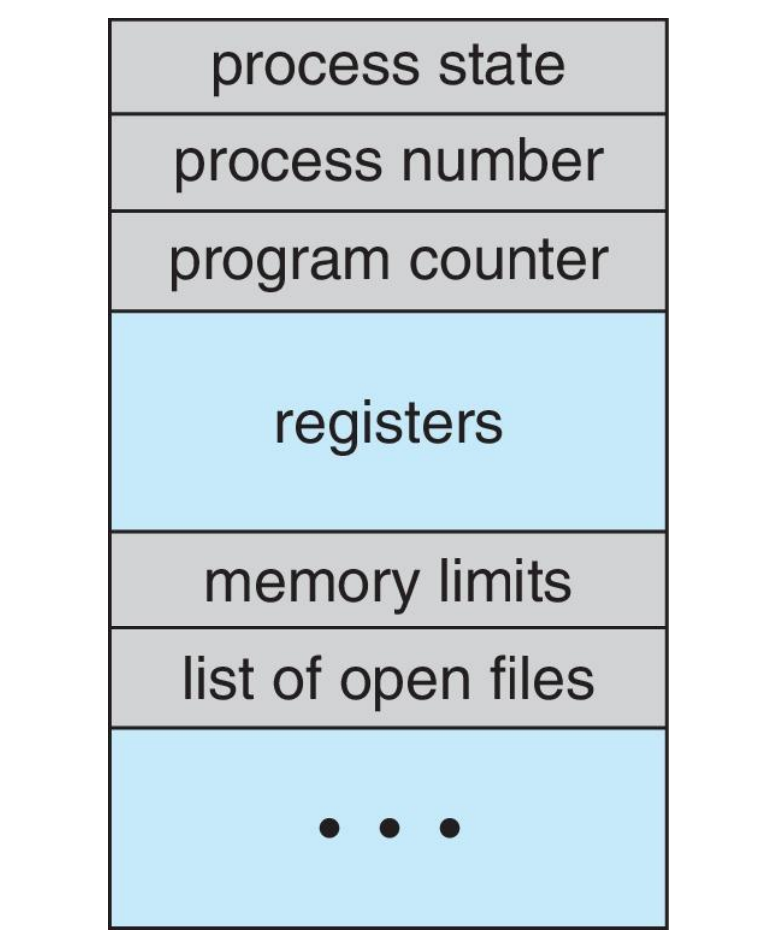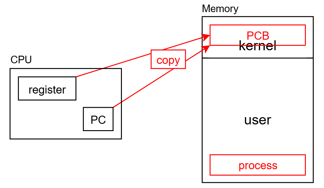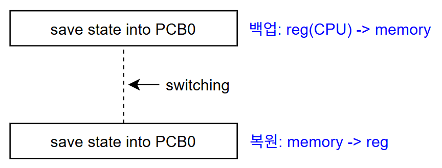 - copy: 다른 프로세스로 전환하려면 현재의 register, PC 값을 백업해 두어야 함 -> 재실행 시, 복원 필요
