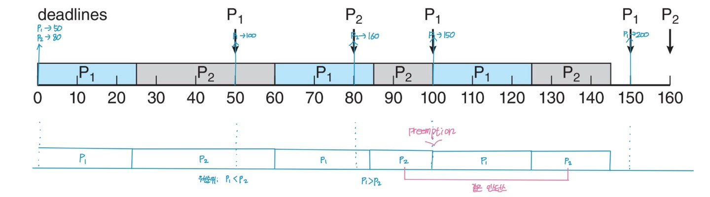 - Absolute Deadline: 도착 시간 + relative deadline -> 동일한 process에 대해서도 인스턴스마다 Absolute Deadline 다름