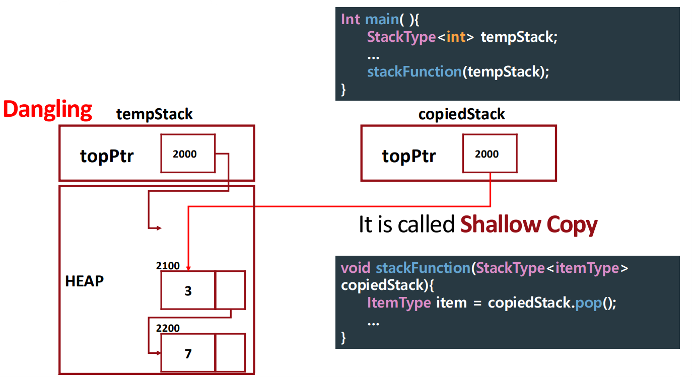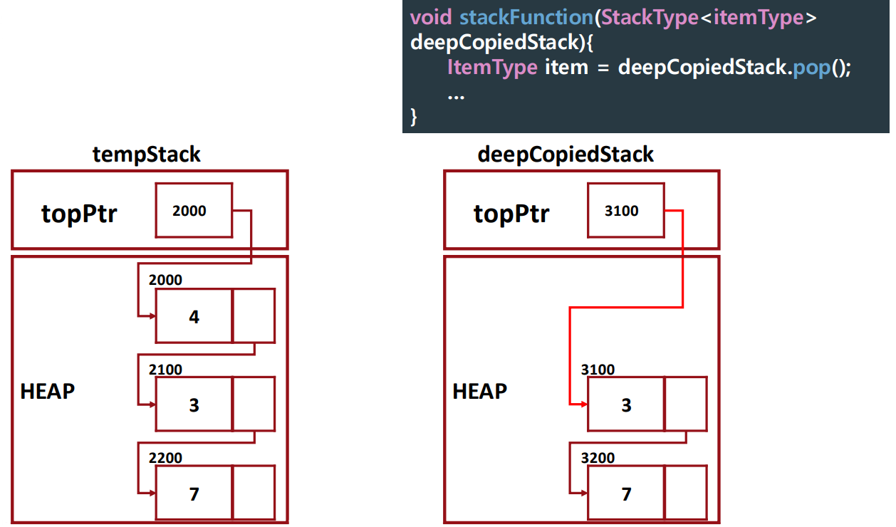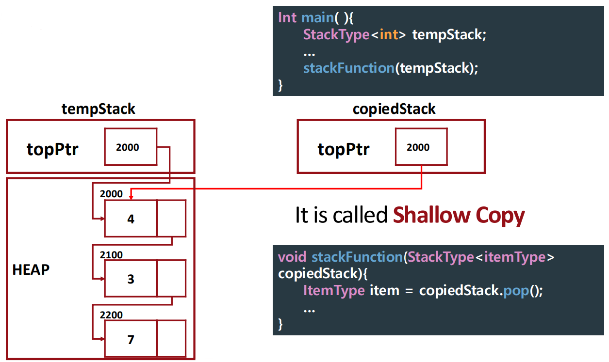 -> copy 시, topPtr만 복사된다. (shallow copy, 얕은 복사)