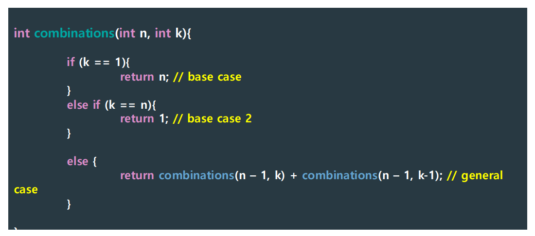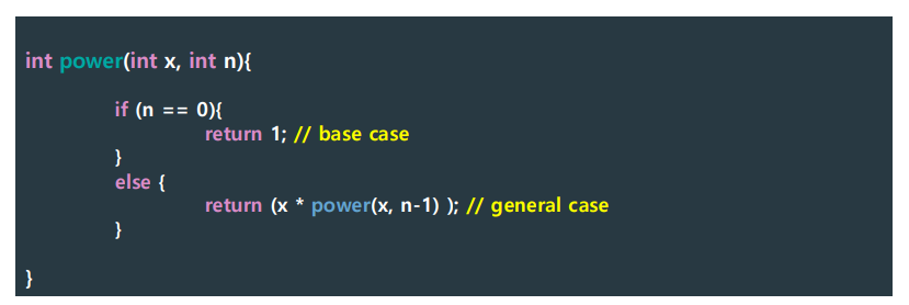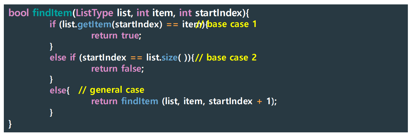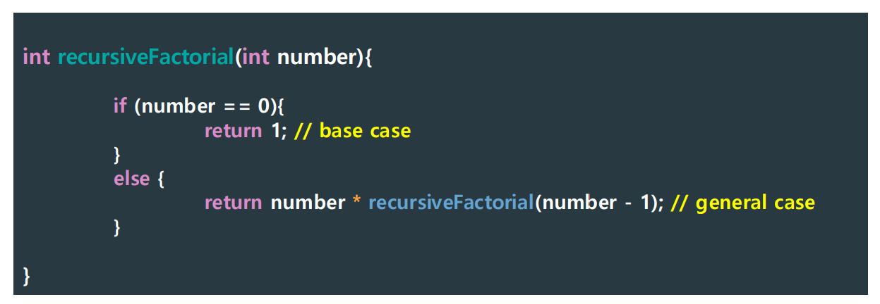 - Base (nonrecursive) case: 멈추는 조건 (언제 끝낼지 정의, 종료 조건)