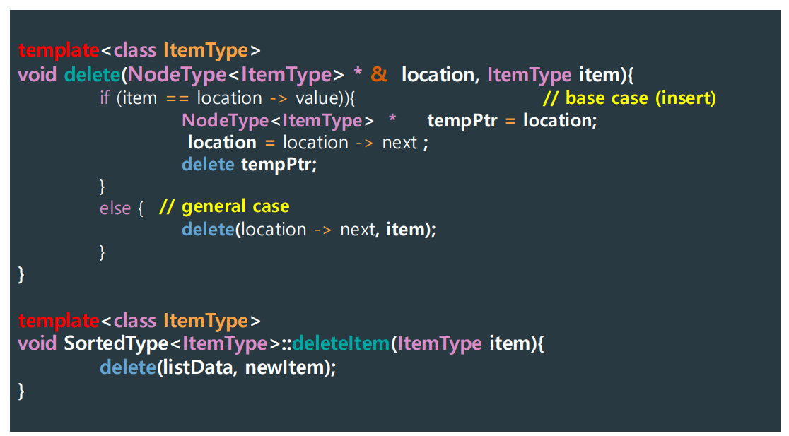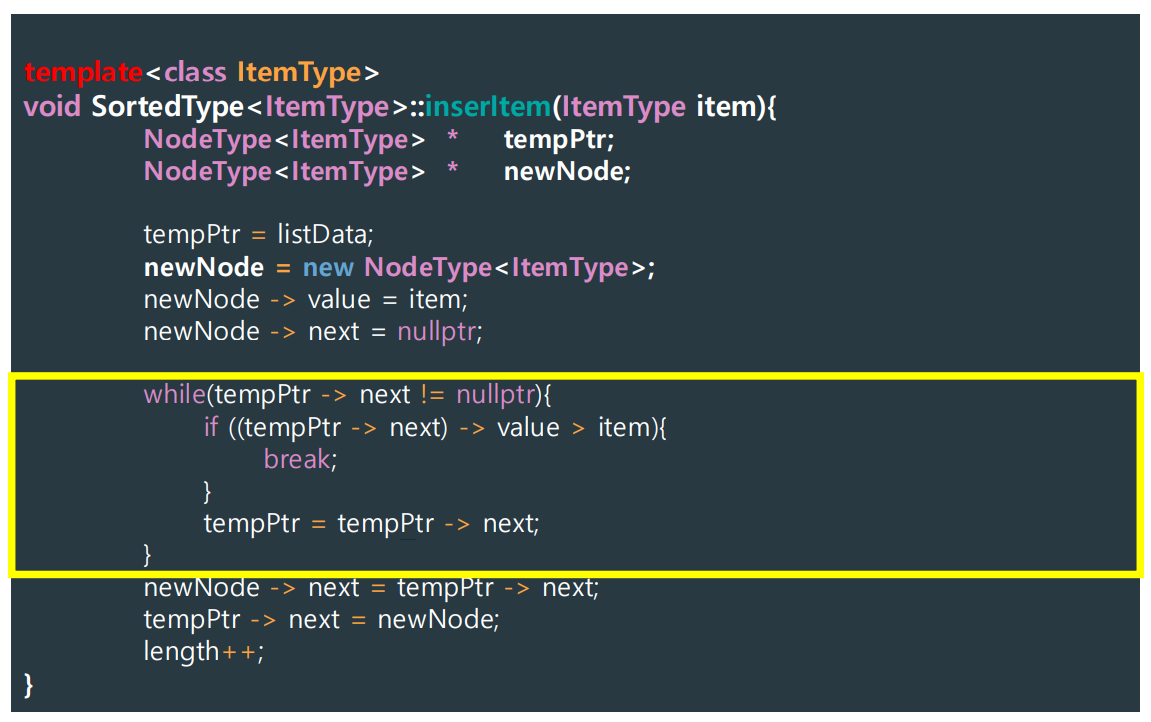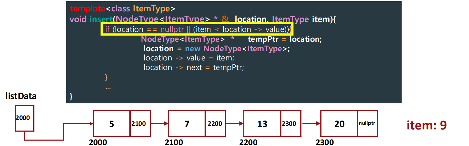 - location == nullptr: item이 list에 있는 값보다 가장 큰 값일 때 or 리스트가 비어있을 때