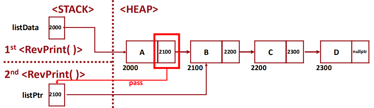 이렇게 pointer 변수가 사용되는 구조에서는 recursion이 필요한 경우들이 있다. (e.g., singly linked structure 역순 print)