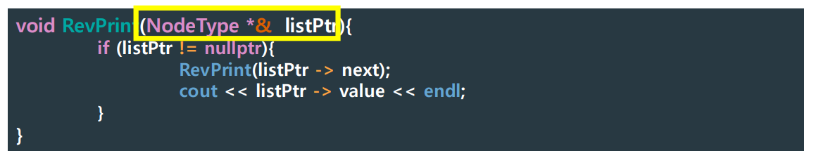 - It passes the pointer "listPtr -> next" through a call-by-ref.