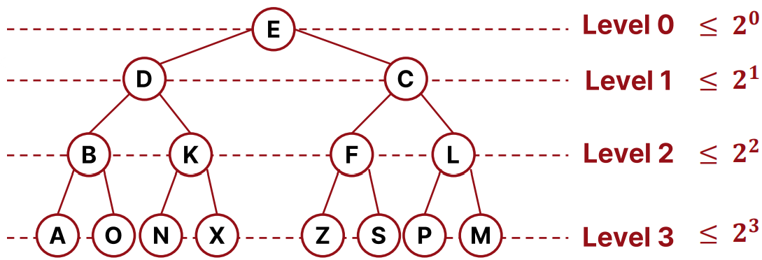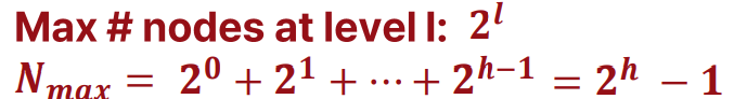 - 완전한 이진 트리라면 높이 h일 때 최대로 가질 수 있는 노드 수는 2^h - 1 이므로 h = log(N + 1)이 됨 (최소 높이)