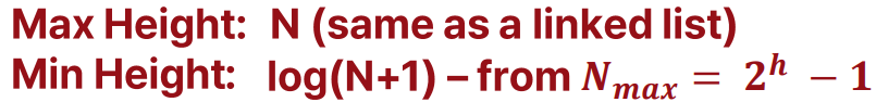 - 반대로, 일직선으로 tree가 만들어져 높이가 최대 높이가 되면 linked structure와 비슷하게 됨 -> max = O(N)