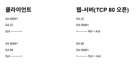 80번 포트만 열린 웹서버는 22번 포트로 클라이언트가 syn을 보낸 것을 받아 연결할 수 없다.