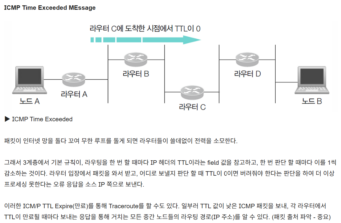 ※ TTL Exceeded는 패킷이 중간에서 너무 오래 도는 문제로, 목적지 도달 전의 문제이고, Destination Unreachable은 목적지까지 갔는데 뭐가 문제가 있는 것으로, 목적지 도달 후의 문제이다. (e.g., 포트 막혀 접근 불가)