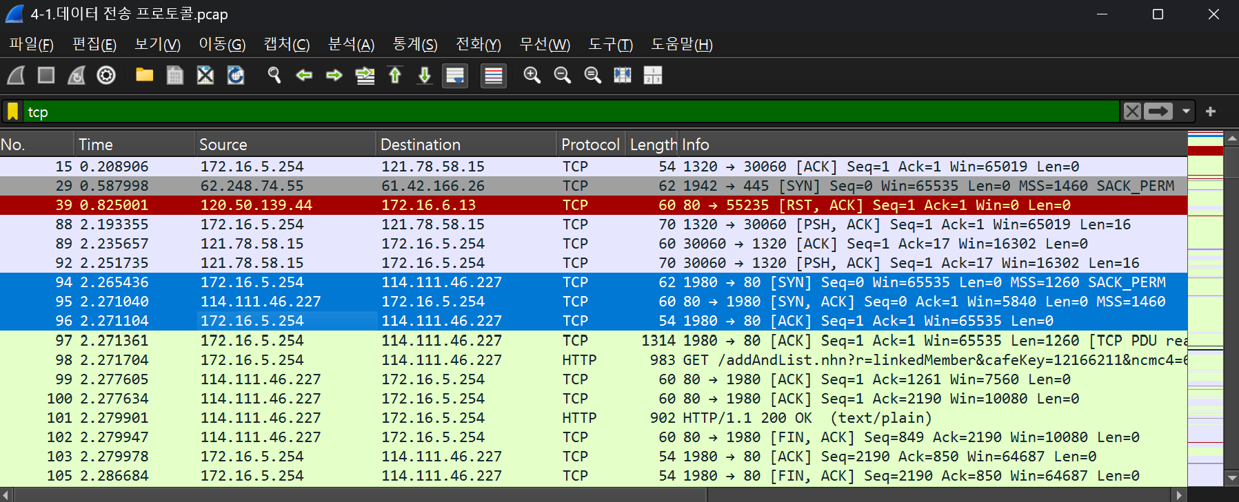 목적지 포트 번호가 80번인 것을 통해 HTTP 요청인 것을 확인할 수 있고, 이때 TCP는 큰 데이터를 한 번에 보내지 않고 적당히 분할하여 보내기에, No. 98은 데이터 요청(HTTP GET), No. 101은 데이터 응답(HTTP/1.1 200 OK)이다.