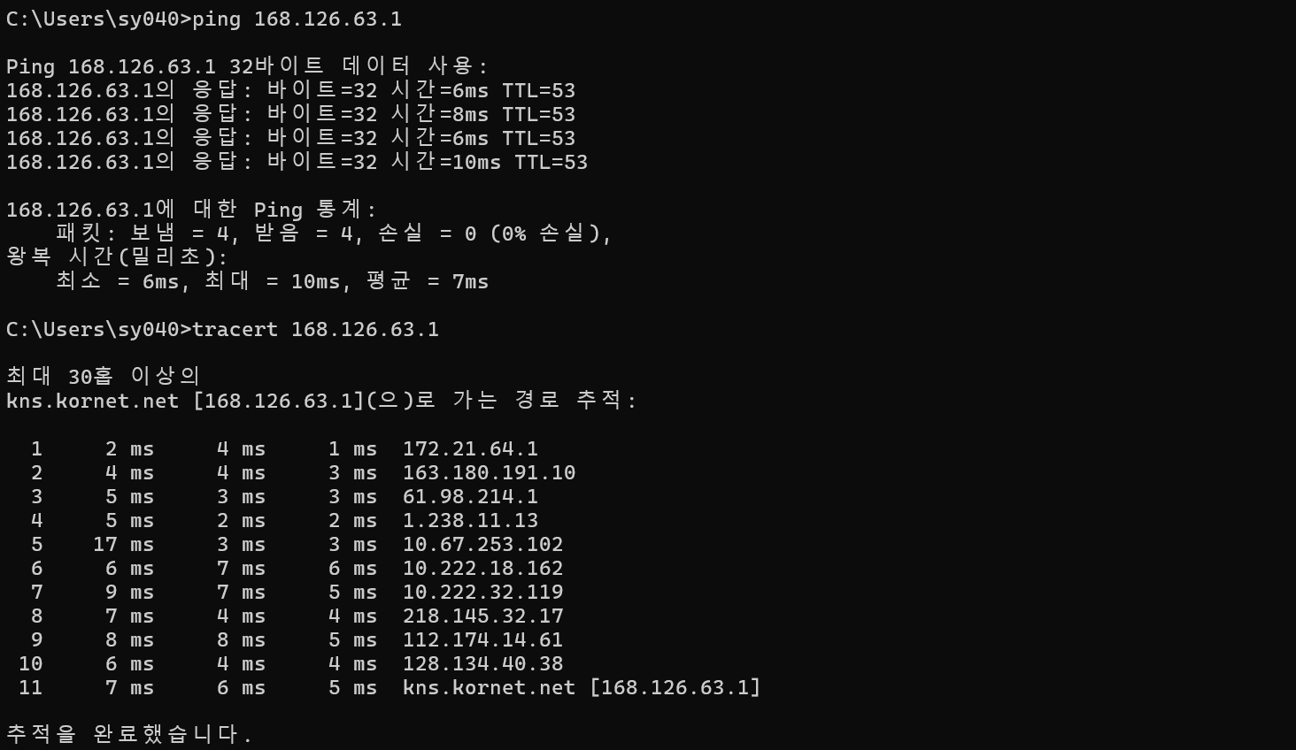 - 명령어: ping, traceroute(Linux / Windows: tracert)
